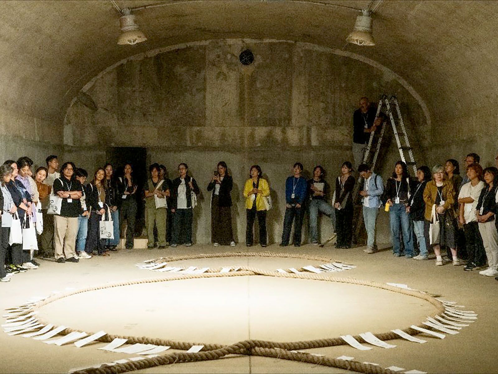 Lì, nell’ex bunker militare della base, è stata installata una grande opera collettiva: una corda di canapa lunga 36 metri, intrecciata a formare i tre cerchi simbolo del Terzo Paradiso di Pistoletto. Su fogli di carta Hanji, i partecipanti hanno scritto messaggi e desideri di riconciliazione, legandoli alla corda in un gesto condiviso che ha trasformato un luogo di separazione in un laboratorio di convivenza. L’opera resterà visitabile fino al 2 novembre 2025, a testimoniare come l’arte possa diventare pratica di pace preventiva.”