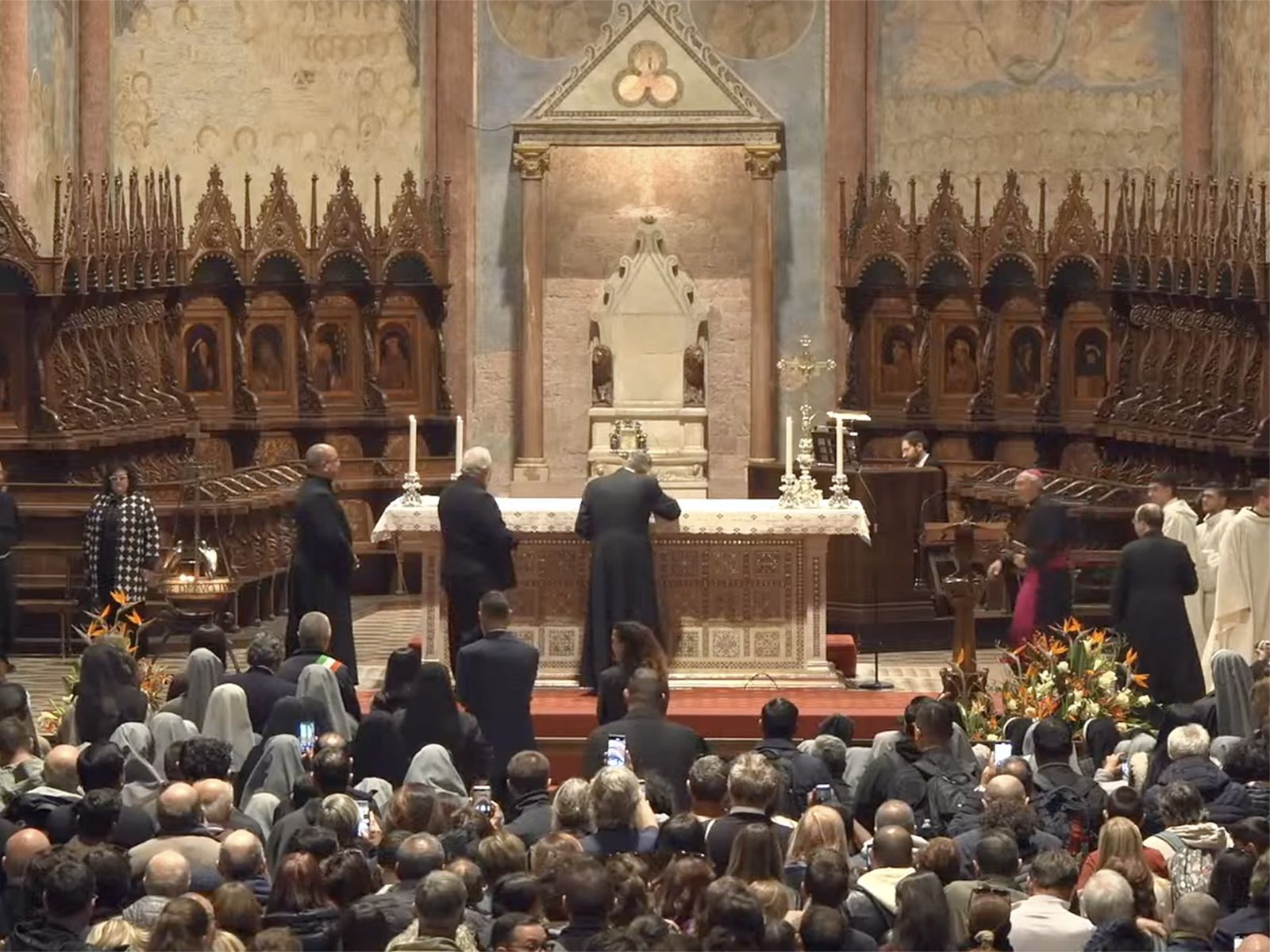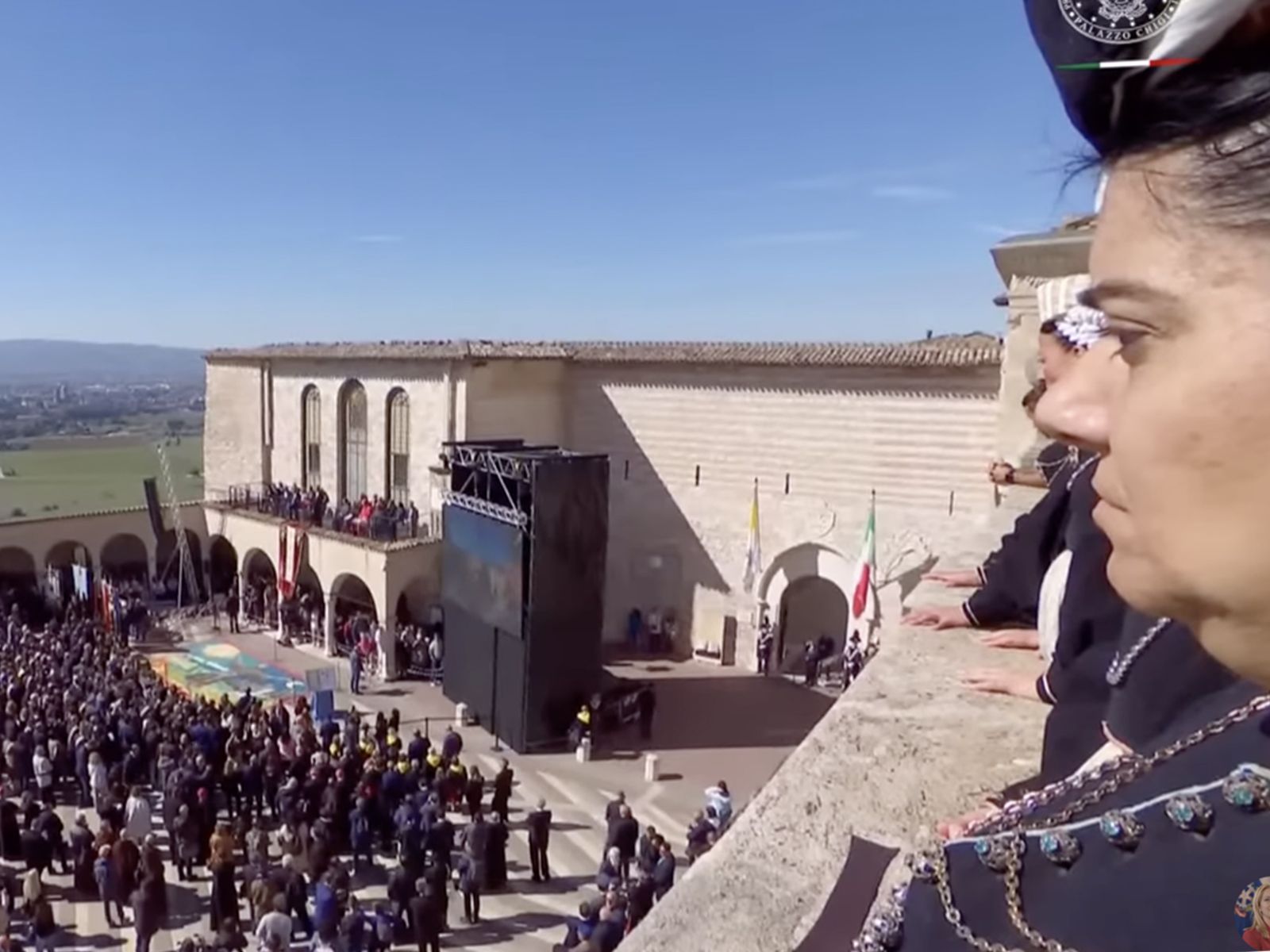 Al canto delle litanie dei Santi si è avviata una processione verso il sagrato superiore, recando ciascuno un ramoscello d’olivo in mano, da dove il vescovo di Assisi, mons.Domenico Sorrentino ha impartito con la preziosa reliquia la benedizione all’Italia e a tutte le comunità della Terra in nome della pace e dell’amore del Creato, come San Francesco andava predicando.