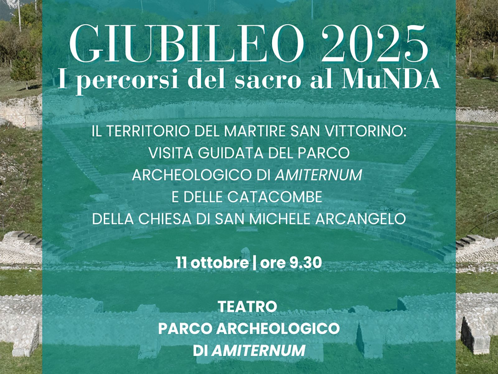 L’11 ottobre alle 9.30 nel Teatro del Parco archeologico di Amiternum si svolgerà una visita guidata tematica dedicata a Il territorio del martire San Vittorino. Nell’anno dedicato al Giubileo della Speranza, il MuNDA ripropone nel mese di ottobre un itinerario di visita organizzato in collaborazione con l’associazione Archeoclub d'Italia sede L'Aquila, la sottosezione Alta Valle dell’Aterno del CAI dell’Aquila e la Parrocchia di San Michele arcangelo di San Vittorino.