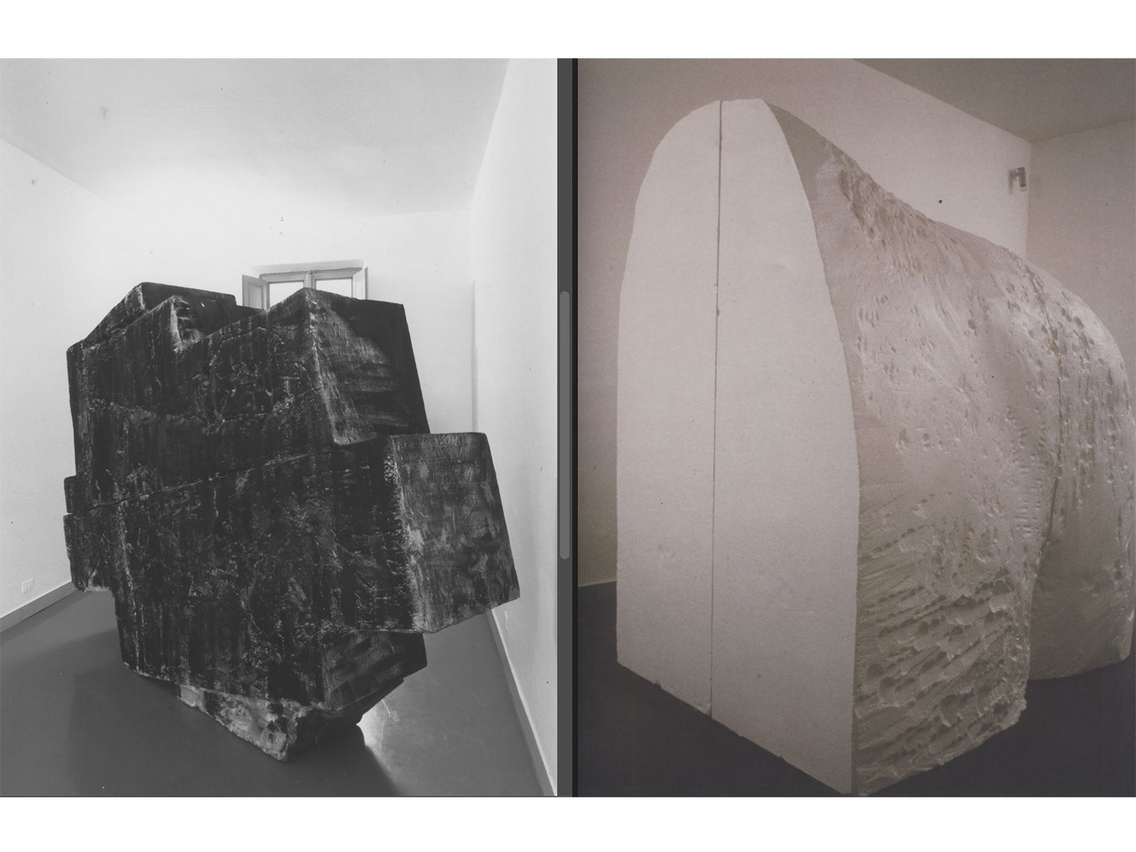 Apre la rassegna La Spalla, una scultura che sembra avere due momenti, un lato prospetticamente levigato, piatto, che evidenzia l’assemblaggio dei blocchi, un altro sbozzato e smussato, tracciando le linee di un’ipotetica forma in formazione. Le altre opere in mostra, apparse per la prima volta nell’esposizione Arte dello Squallore nella Galleria di Giorgio Persano nel 1985 e nel 1986 proprio nella Galleria Pieroni di Roma, sono costituite da superfici e volumi dai colori scuri e cupi, grandi blocchi di poliuretano. L'artista ha spesso utilizzato per questi lavori anche l'espressione “materiale anonimo”, lavori che stanno in un campo indefinito tra pittura e scultura.