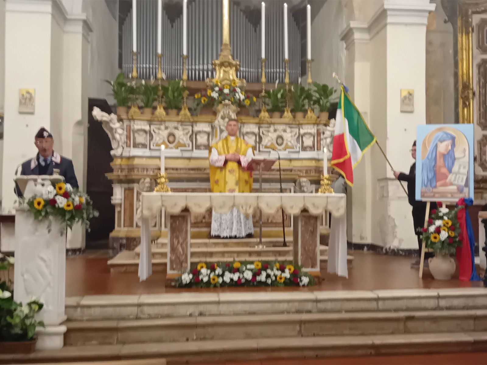 A lato dell’altare, su decori rosso e blu, che simboleggiano l’amore ardente e il valore militare del carabiniere, è stata posta una bella icona della Vergine. Il coro parrocchiale ha egregiamente esaltato la cerimonia in un clima di festa.
