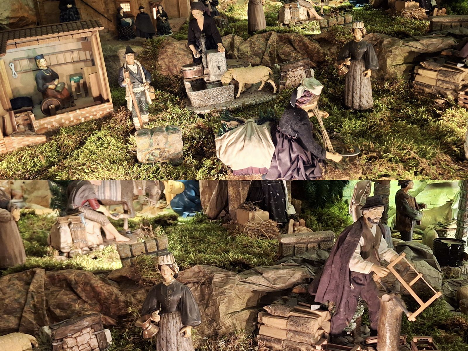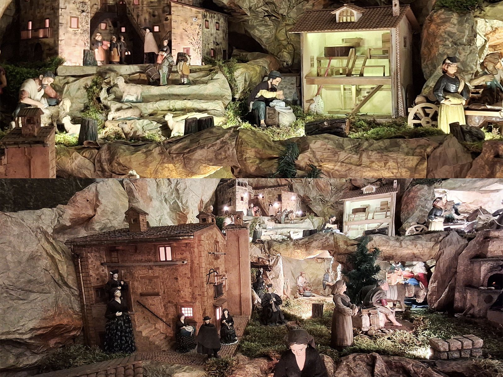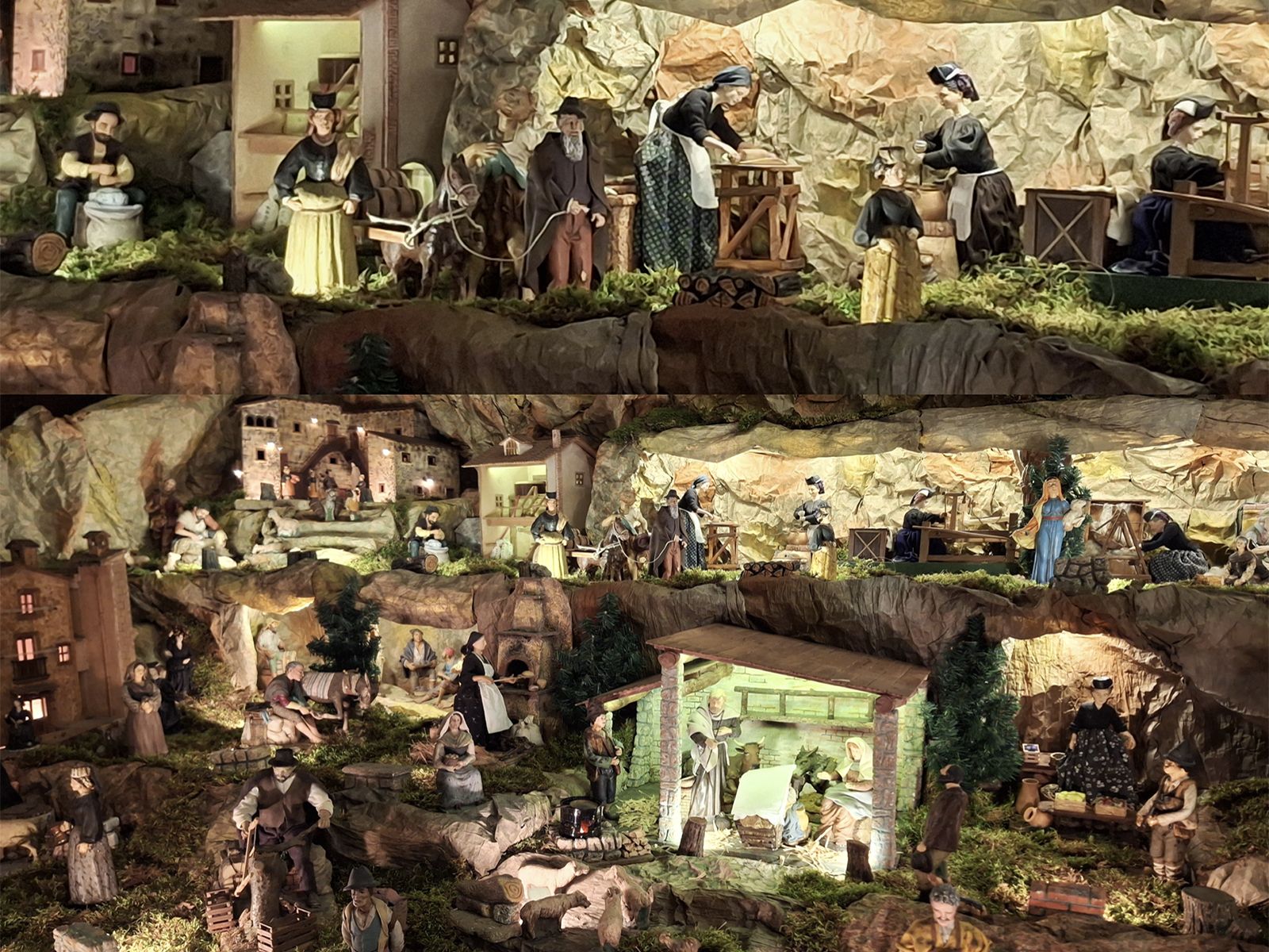 Quello che è straordinario in questa ricostruzione della natività è la cura del dettaglio e del particolare, dagli edifici realizzati a mano agli interni delle case, arredati nei minimi particolari, dai quali si intravedono i personaggi femminili impegnati nelle loro faccende quotidiane.