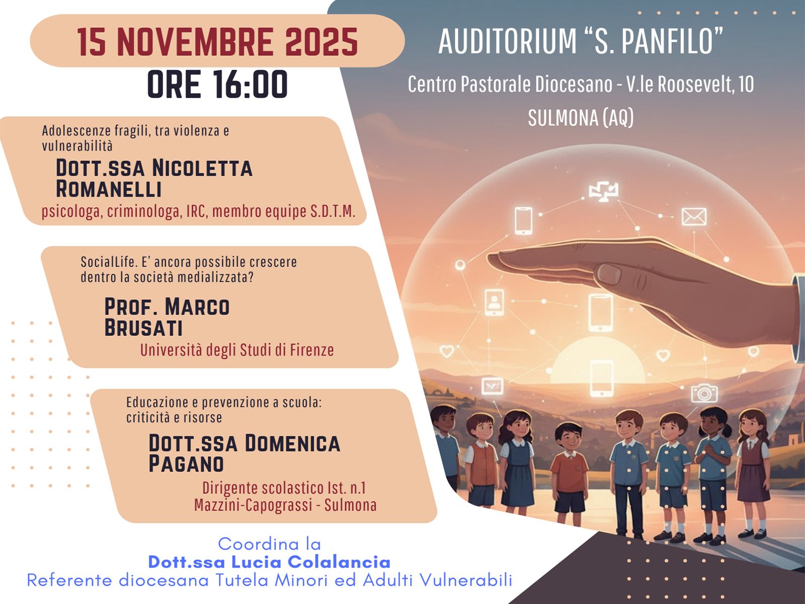 Sabato 15 novembre 2025 alle ore 16:00, presso l’Auditorium “San Panfilo” nel Centro Pastorale, viale Roosevelt n. 10, a Sulmona, la cittadinanza è invitata a partecipare al IV Convegno Diocesano Tutela Minori, sul tema: “Educare alla relazione. Quale tutela dei minori nell’epoca social?”. L'ingresso è libero e gratuito.