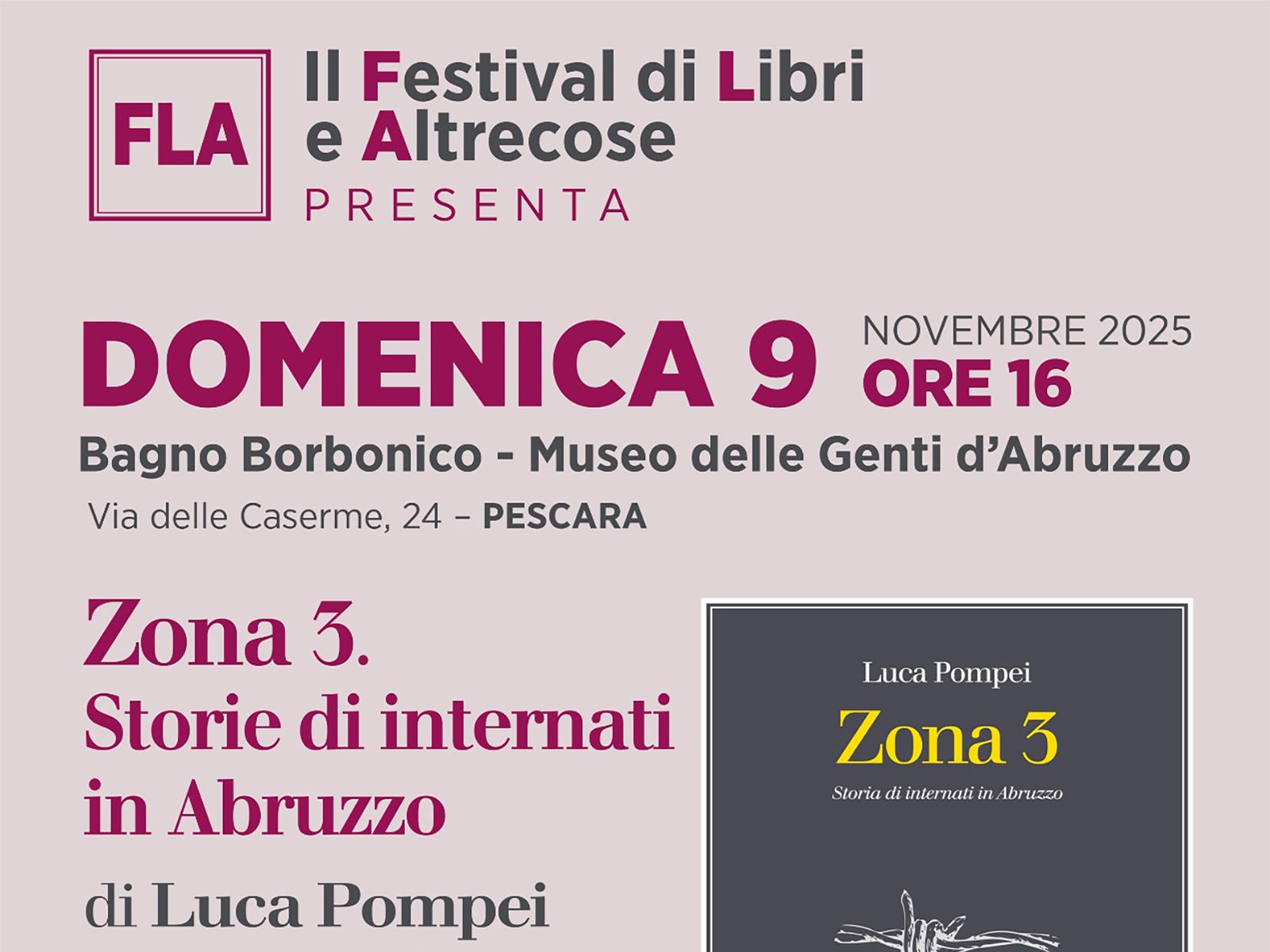 "Zona 3" il nuovo libro del giornalista Luca Pompei, con prefazione di Giuseppe Lorentini, ricostruisce questa storia dimenticata, seguendo le tracce di uomini e donne che vissero la sospensione e l’incertezza di quei giorni. Non eroi o generali, ma persone comuni, finite in una geografia di sorveglianza e di silenzi. La prima presentazione è prevista per domani domenica 9 novembre alle ore 16.00, all'interno del Fla di Pescara, nella sala del Bagno Borbonico, presso il Museo delle Genti d'Abruzzo (via delle Caserme 24).
