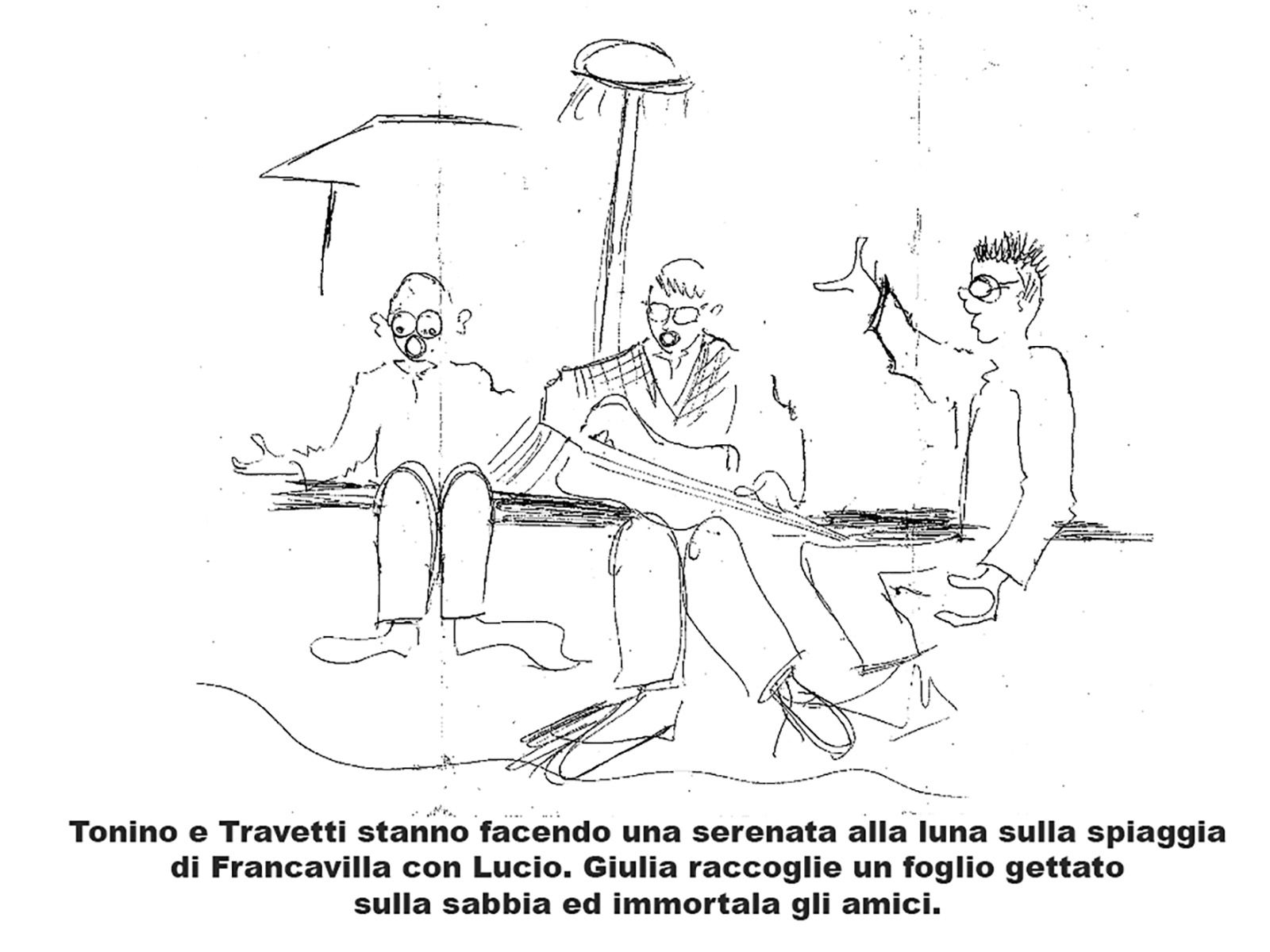 Quella sera, per la perdita al gioco toccava pagare a Travetti: molto spesso gli amici di quella specie di “Legione straniera” scendevano a Francavilla, o ad Ortona, o a Pescara, o a San Vito, o a Termoli e si riunivano attorno ad una tavola imbandita pagando il conto a turno. Andarono a “La nave” di Francavilla e consumarono un antipasto di mare, spaghetti alla Faruk, arrosto di pesce, zuppa inglese, navetta (un omaggio della ditta) e vino. Seneca dice che la vita è come una favola, non quanto è lunga, ma quanto sia ben narrata. Quindi, bisogna narrarla bene; ricetta: un’allegra e assortita brigata attorno ad una buona tavola.