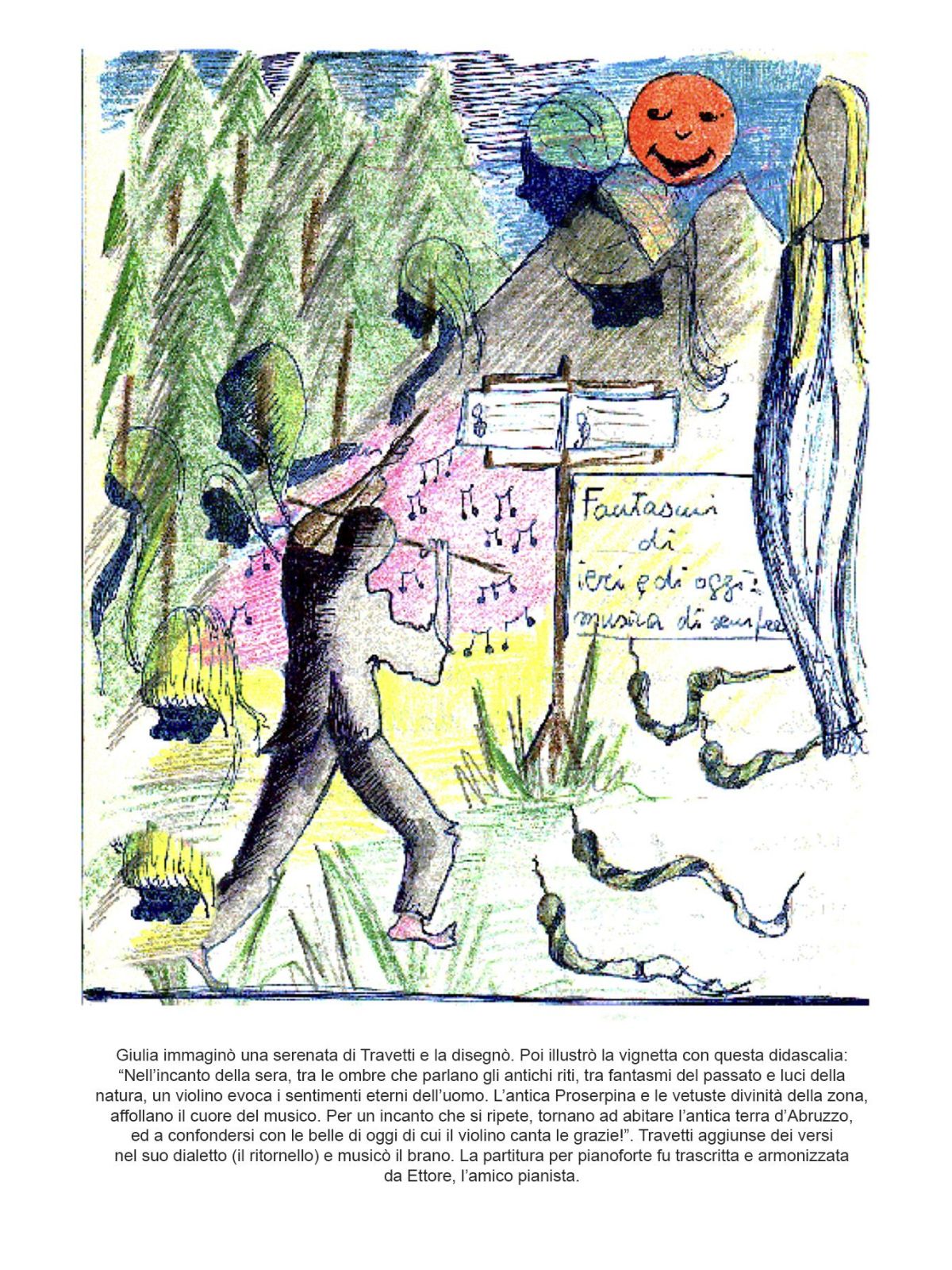 Poco importa che poi si diventi euforici e si torni con una macchina in meno, visto che le chiavi dell’automobile di Giancarlo erano state gettate da qualche commensale più brillo nel buio della notte, ed il proprietario, arrabbiato, se n’era andato a dormire in un albergo di Francavilla. Perché questo era successo dopo cena. Travetti arrivò in città assonnato e stanco; e così andò al lavoro poche ore dopo, cioè la mattina seguente. Fatte le brave sei ore, che in quelle condizioni più che brave furono fastidiose, si organizzò per la nuova giornata, che per lui cominciava alle due pomeridiane. Riemerse dal portone annoso e si tuffò nella luce di una splendida giornata. Incontrò per via un altro travet, e con un sorriso innocente lo catechizzò sulla necessità di vivere nella luce naturale, nella pulizia del cielo terso... Poi giunse a casa, mangiò; dopodiché montò su Peppinella e andò a gustare il tramonto sul mare, press’a poco dove la “vecchietta delle telline” raccoglieva i frutti di mare. A questo punto sembra opportuno aprire una parentesi. Dopo l’acquisto di Peppinella, quando la mattina Enzo si alzava molto tempo prima di andarsi a sedere davanti alla consueta scrivania, scendeva a gustare il paesaggio meraviglioso fra i pini della riviera retrostante alla torre di Cerrano (D’Avalos?): questa doveva essere stata una torre di avvistamento fra il verde del mare e il verde dei pini che costeggiavano la riviera.