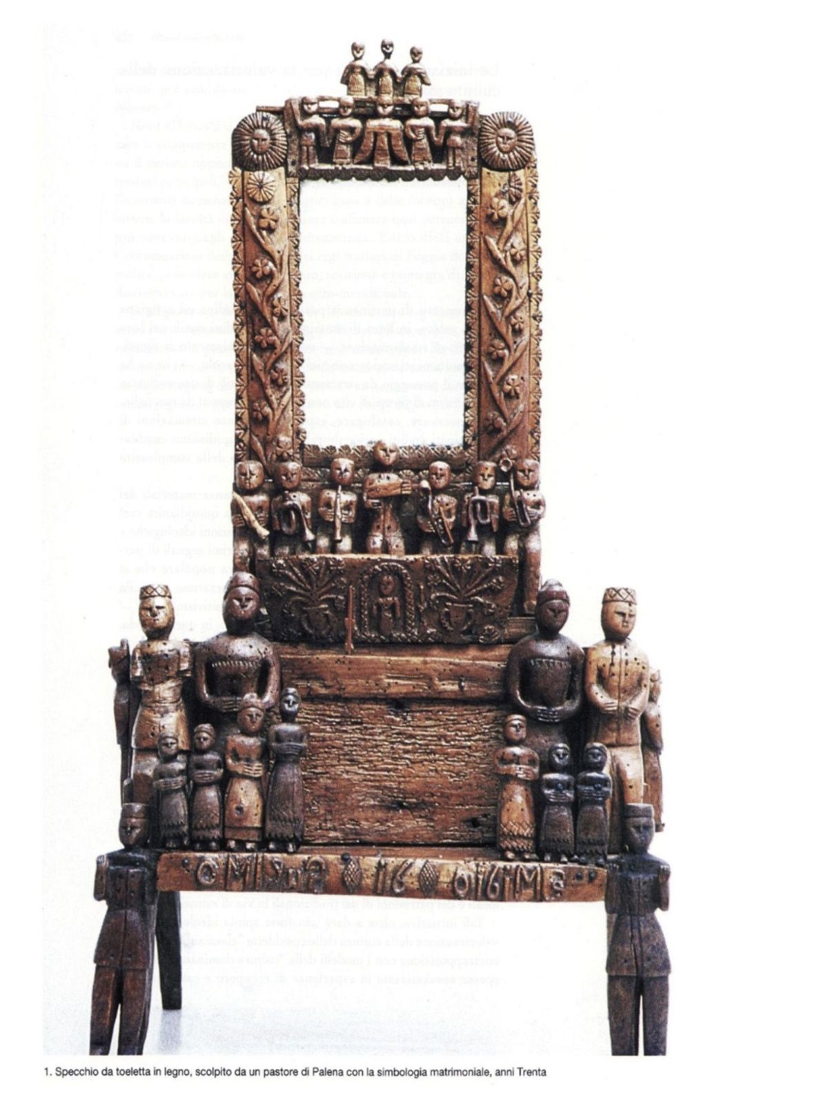 Nei primi decenni del Novecento un pastore scultore di Palena, del quale non conosco il nome, lasciò una traccia indelebile nel mondo dell’artigianato realizzando uno specchio (v. foto) in cui riassunse le tradizioni e i simboli del matrimonio: pure qui emerge la vena nostalgica del pastore esiliato, e lontano dagli affetti per nove mesi, per affrontare lo stagionale e duro svernamento… Siamo al vespro della transumanza; anzi, potremmo dire che già il lamento di Jurico per il duro lavoro del pastore povero esprime il rantolo della poetica creata da Alfonso il Magnanimo.