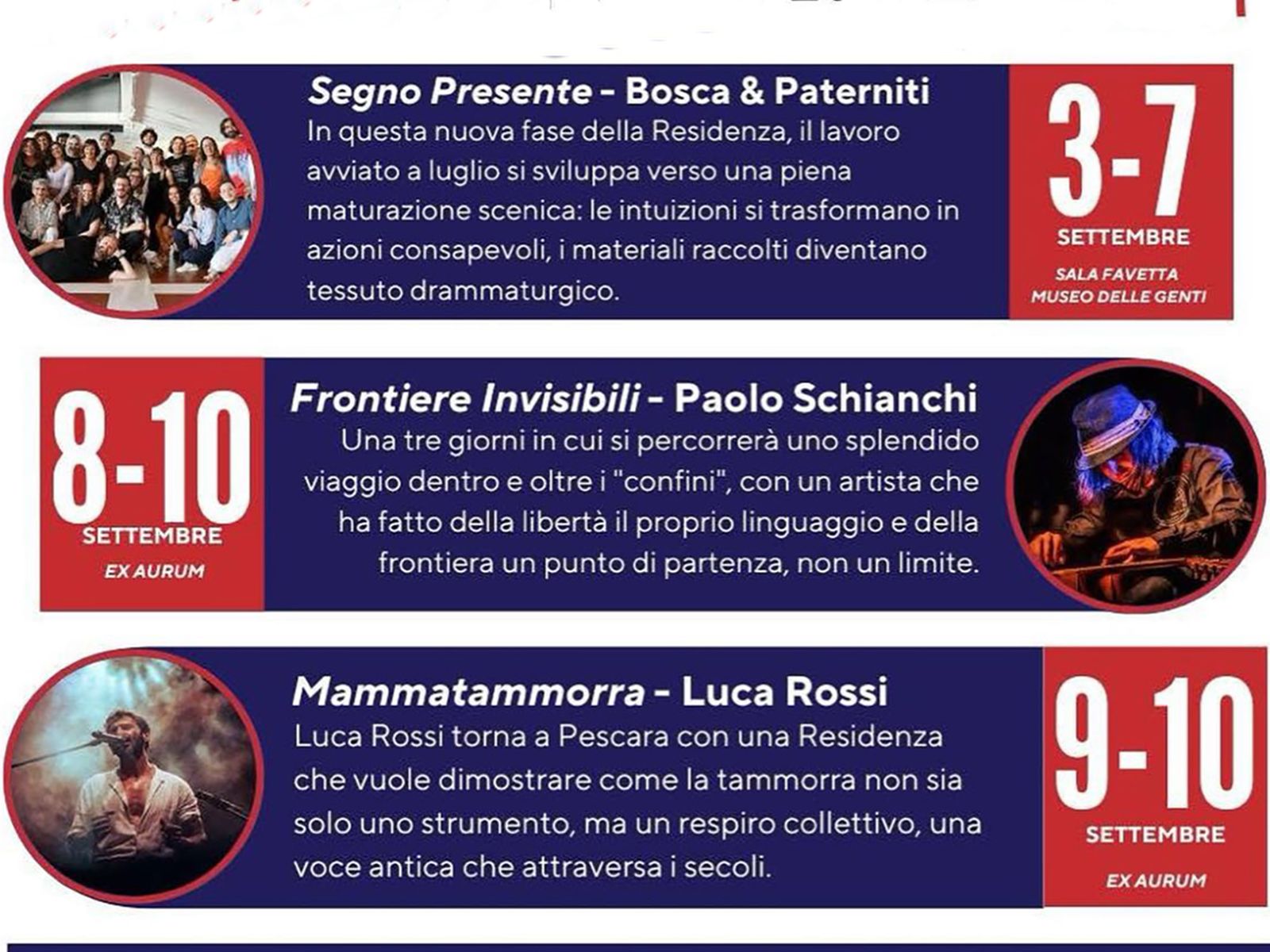 Sempre all’Aurum, il 9 e 10 settembre, torna anche Luca Rossi con una Residenza che restituisce la tammorra come “respiro collettivo”, una voce antica che attraversa i secoli. Partecipazione gratuita grazie al Comune di Pescara.