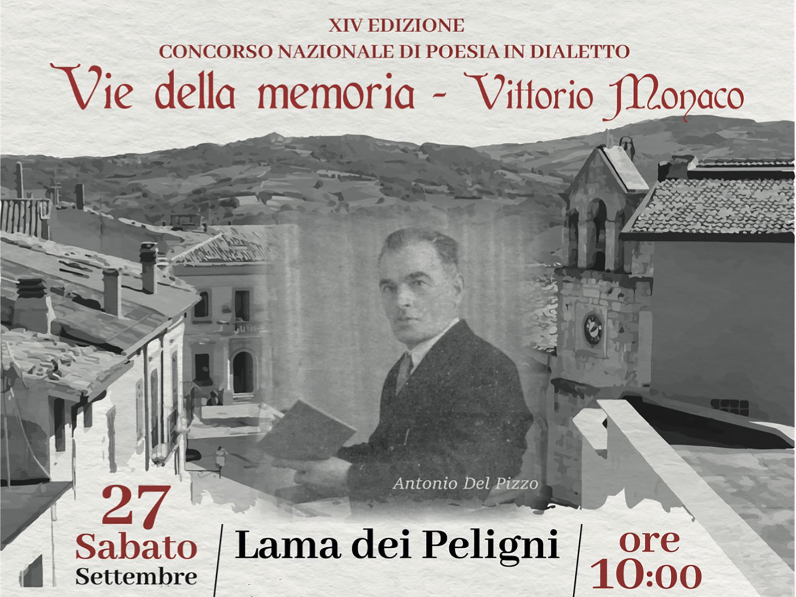 Si svolgerà sabato prossimo, 27 settembre, a Lama dei Peligni, in onore del poeta Antonio Del Pizzo, la Cerimonia di Premiazione della XIV Edizione del Premio Nazionale di Poesia in Dialetto VIE DELLA MEMORIA – VITTORIO MONACO, promosso dallo SPI Abruzzo e Molise e dal Centro Studi e Ricerche Vittorio Monaco e, quest’anno, organizzato in collaborazione con il comune di Lama dei Peligni.