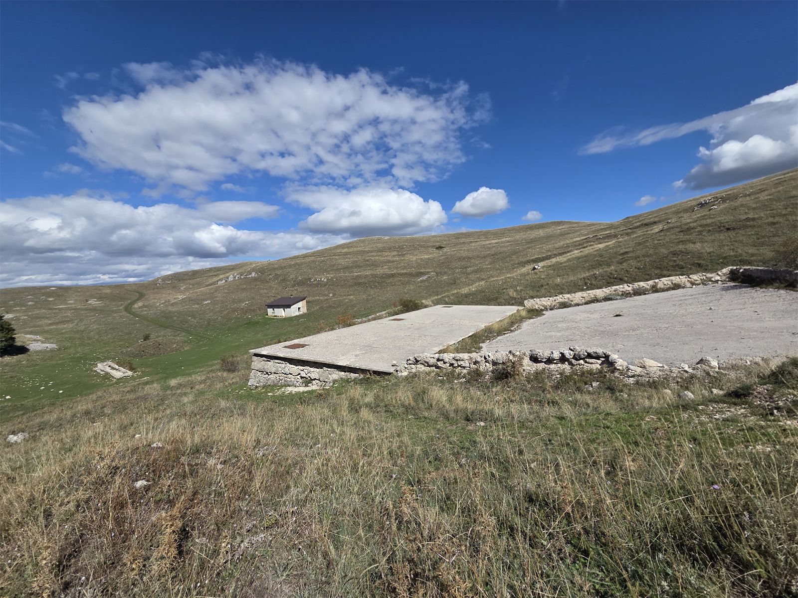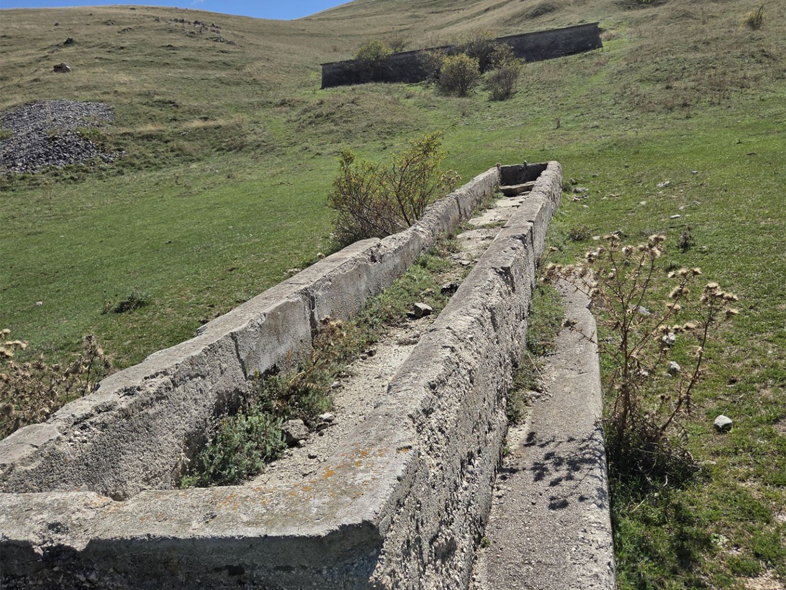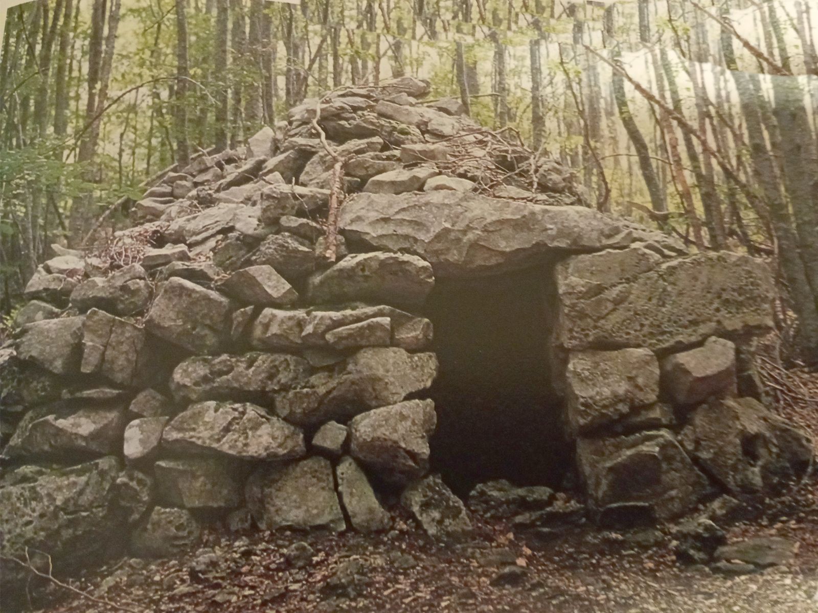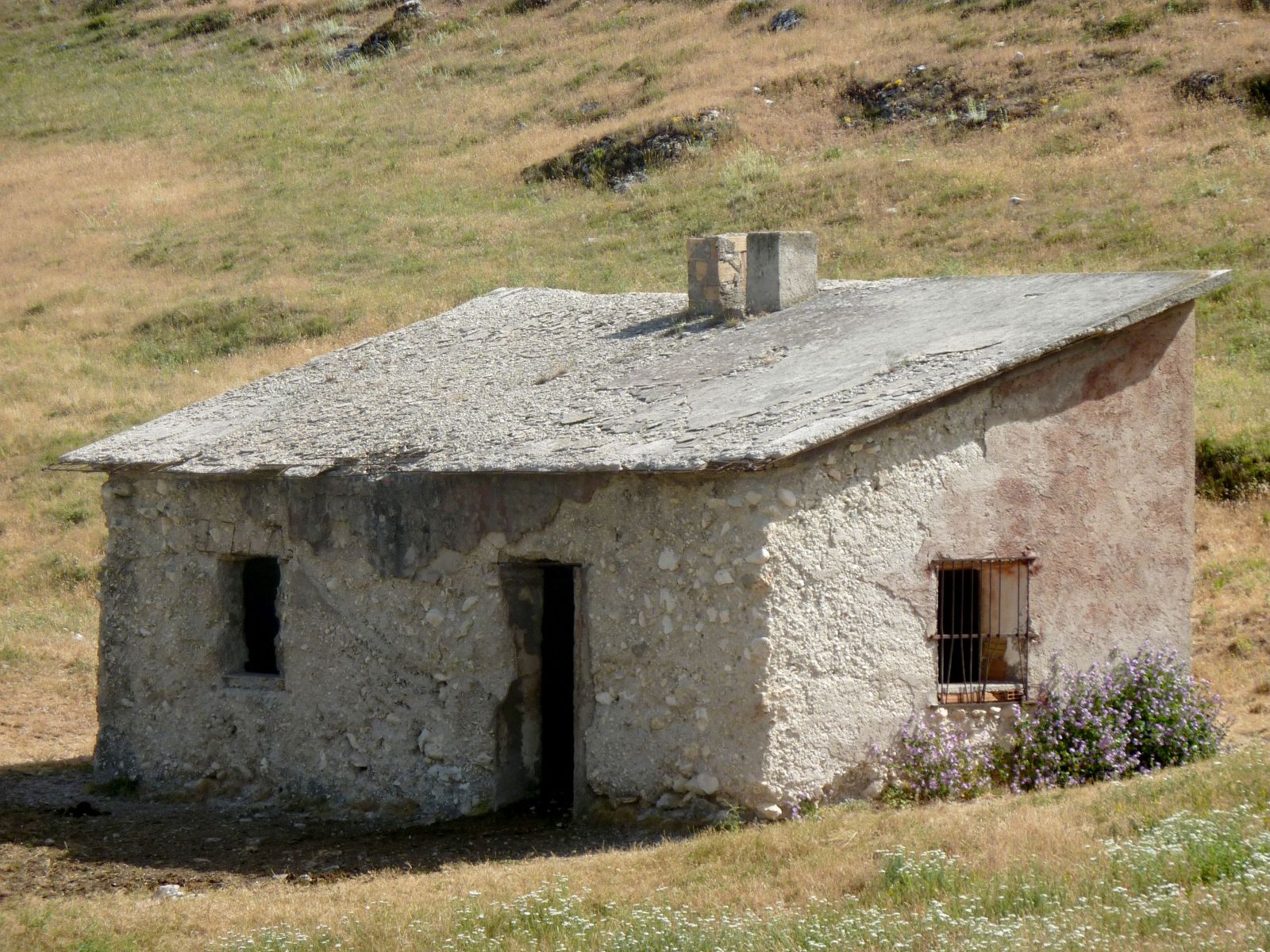Su una montagna, sopra a quella della “Selva”, a occidente di Cocullo, lungo il percorso Scanno-Forca Caruso, tratturello del più grande Celano-Foggia, montagna sulla cui cima corre lo spartiacque fra la zona marsicana e la valle peligna, qualche chilometro prima dell’Olmo di Bobbi era fissata su una spianata una “posta” attrezzata per il passaggio delle greggi: un piccolo e rozzo edificio (foto 1) (ristrutturato vent’anni fa, foto 2) per il ristoro dei pastori e, alla parte opposta, un grosso abbeveratoio (foto 3, 4) che forse nell’Ottocento trasformò il nome alla località: la “Cisterna”. La zona prima era chiamata “Vaschie de tume” (Vasche di timo). Il nome è poetico e a questo punto è opportuno riportare un brano scritto da Luciana Cosmai, “Le pietre senza tempo dei pastori” (vedi “La civiltà della transumanza”, a cura di Edilio Petrocelli, Cosmo Iannone Editore, 1999): il pastore “realizza la sua dimora lungo le vie della transumanza… le innumerevoli costruzioni scandiscono il paesaggio e colorano i campi, incorniciando le strade e i sentieri. Le pietre sono lì, sulle montagne, si cavano dalla roccia e si lavorano con l’uso di semplici strumenti… Il ricovero del pastore rappresenta un esempio tipico dell’uso della pietra che, senza il ricorso a lavorazioni, strumenti particolari o malte leganti, viene montata a secco per realizzare strutture in equilibrio che ricalcano il modello arcaico della tholos greca…” (foto 4)