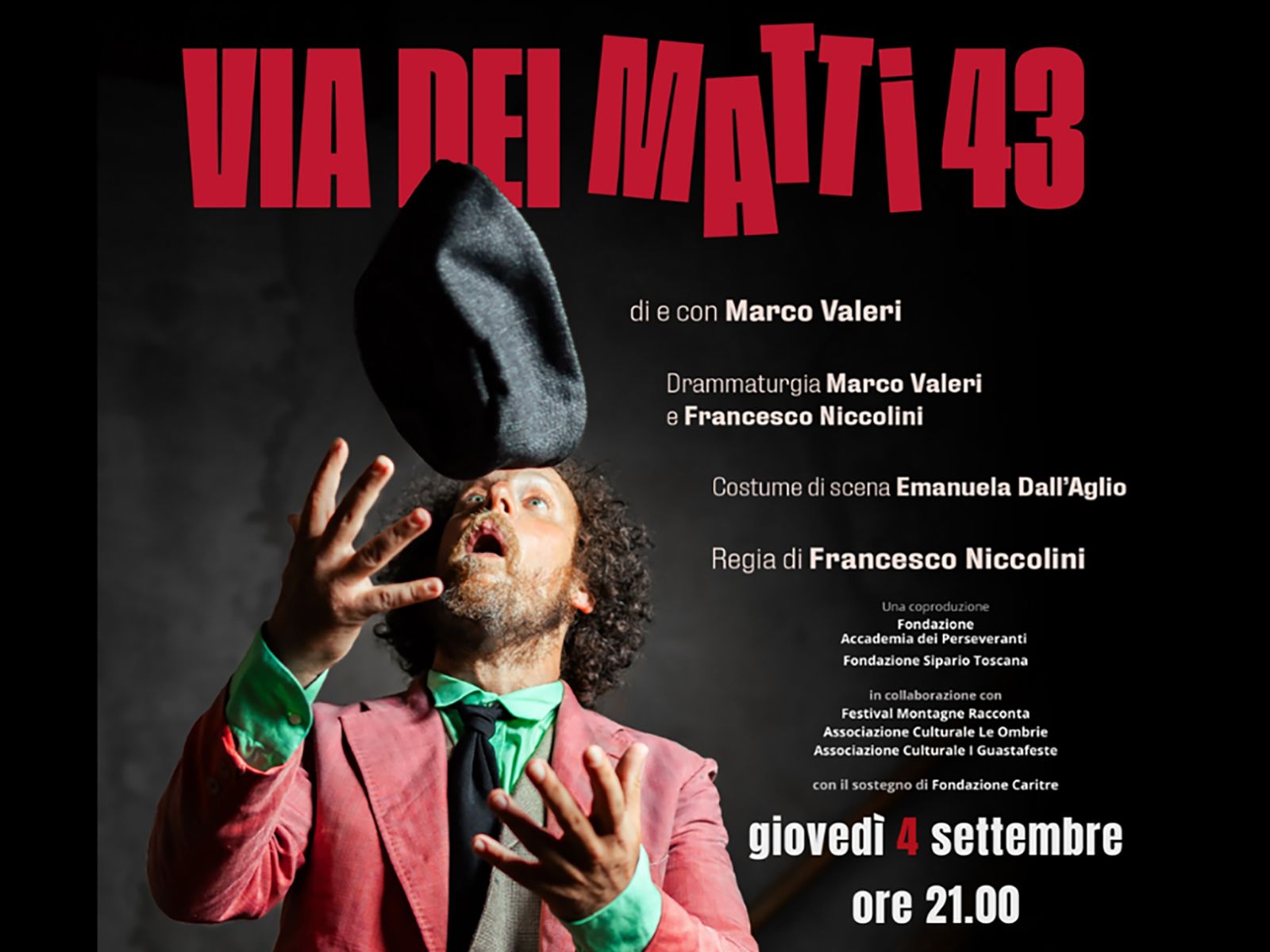 “Via dei Matti 43” si distingue per la scrittura personale di Marco Valeri, capace di intrecciare memoria, quotidianità e immaginazione, accompagnato dalla regia sapiente di Francesco Niccolini, drammaturgo e autore che da anni lavora sulla contaminazione tra teatro di narrazione e nuove forme sceniche.