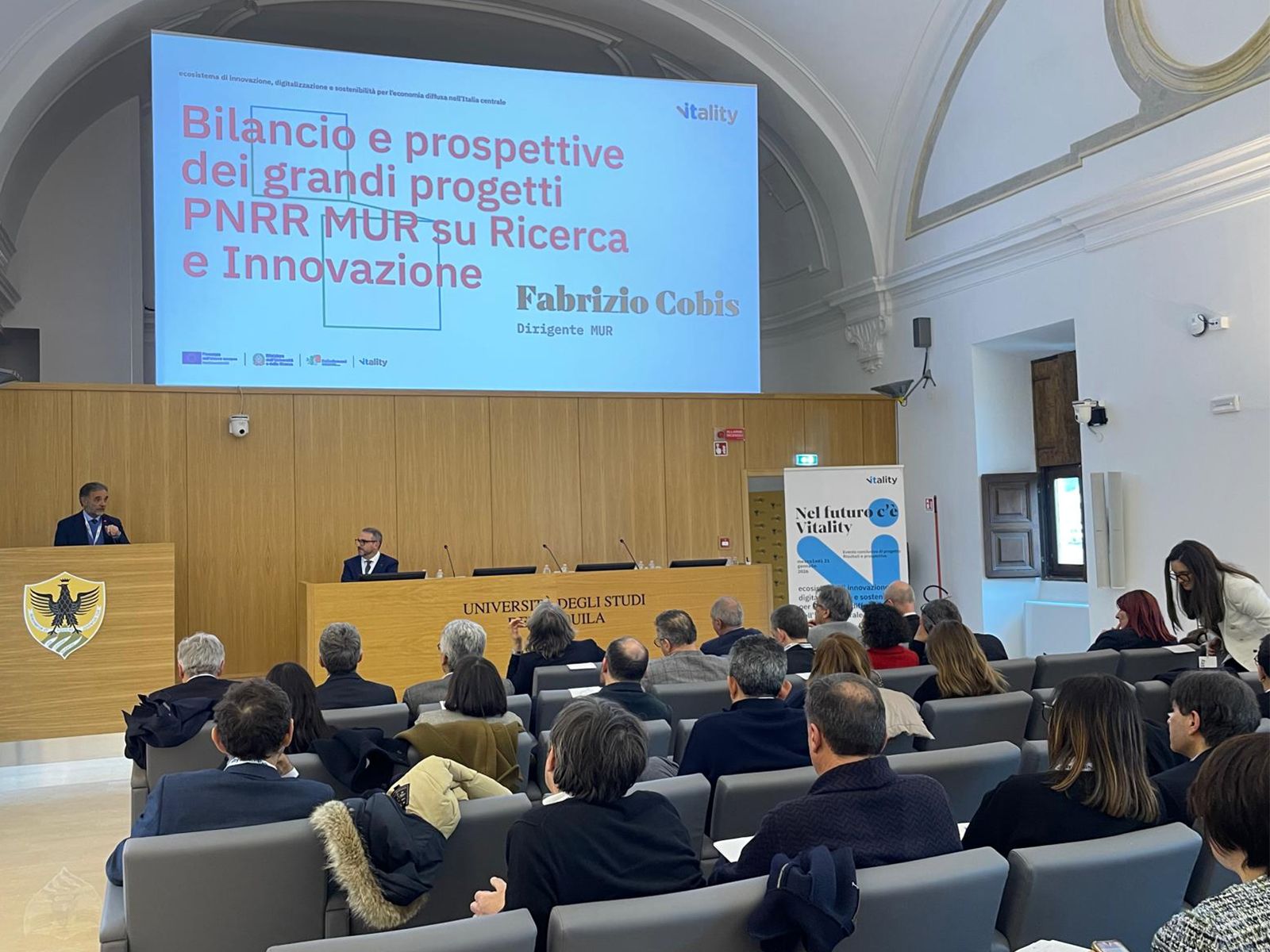 Si è svolto mercoledì 21 gennaio 2026 nel capoluogo abruzzese delL’Aquila, presso il Centro Congressi “Luigi Zordan”, l’evento sul tema “Nel futuro c’è Vitality”, organizzato dalla Fondazione Vitality, che ha presentato i risultati del progetto “Vitality - Ecosistema di Innovazione, Digitalizzazione e Sostenibilità per l’Economia Diffusa nell’Italia Centrale”, finanziato dall’Unione Europea - NextGenerationEU e sostenuto dal Ministero dell'Università e della Ricerca nell'ambito del PNRR, che coinvolge le Università di Abruzzo, Marche e Umbria.
