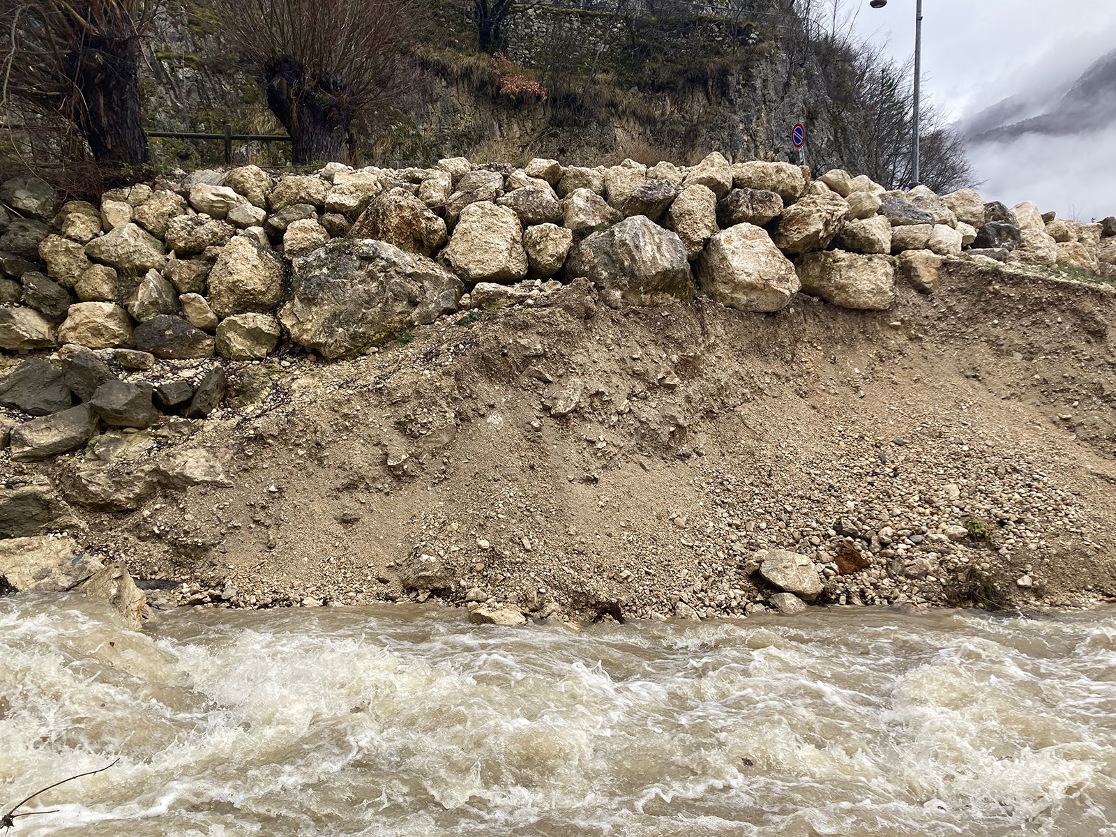Ieri mattina, fermandoci ai prati, lato chiesetta, ci ha richiamato un forte rumoreggiare dello scorrere dell’acqua, proveniente dalla foce del fiume. Ci siamo avvicinati e l’abbiamo visto in piena, irrompere con rapidità tra i massi e i grovigli di sterpi fino a calmarsi al lago.