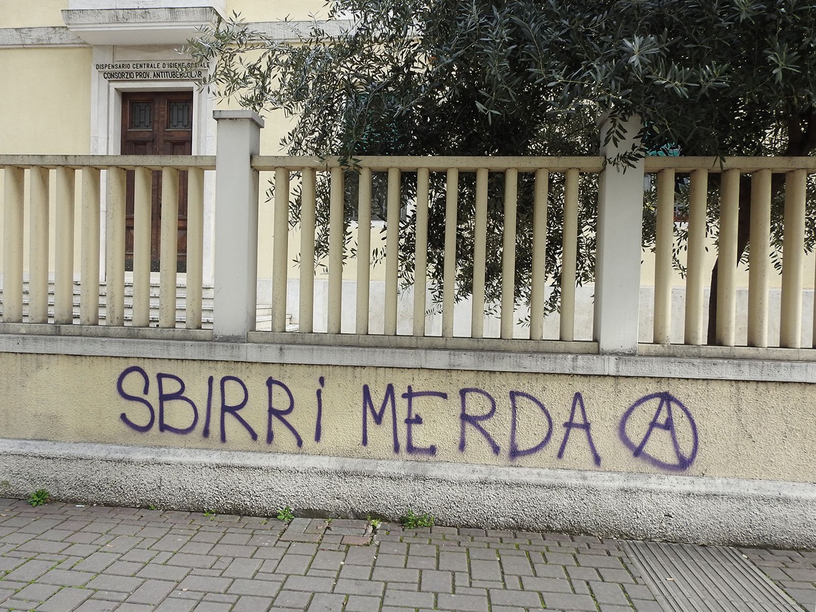 Gli anarchici nel nostro Stato democratico hanno diritto di parola e di libera manifestazione del pensiero, ma non tutela se la parola è espressione di offesa alla Stato e ai loro servitori. Lasciare per anni una scritta simile, Gentile Sindaco, è solo un’offesa alla sua città, ma a tutti noi abruzzesi.