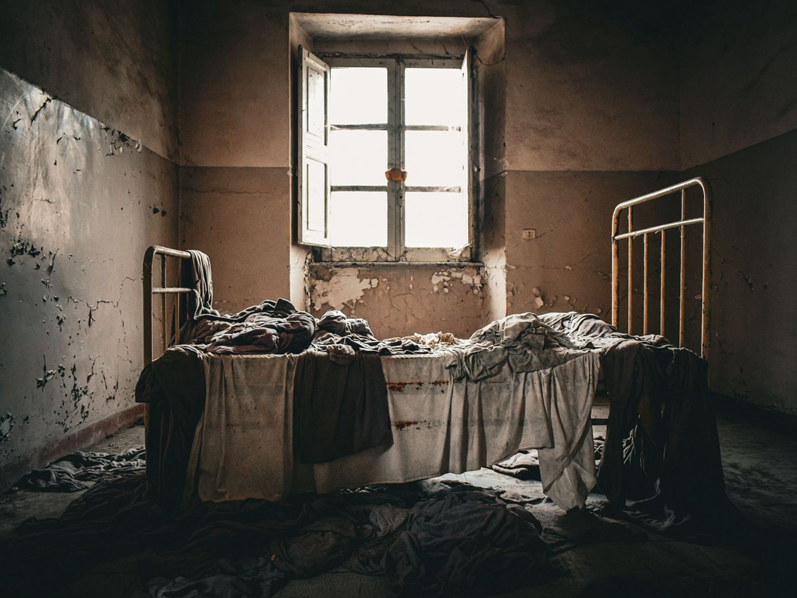 Un letto di ferro disfatto, materassi ingialliti, tessuti impolverati, una finestra spalancata e muri scrostati raccontano di fragilità, di vite interrotte e memoria che si sgretola.