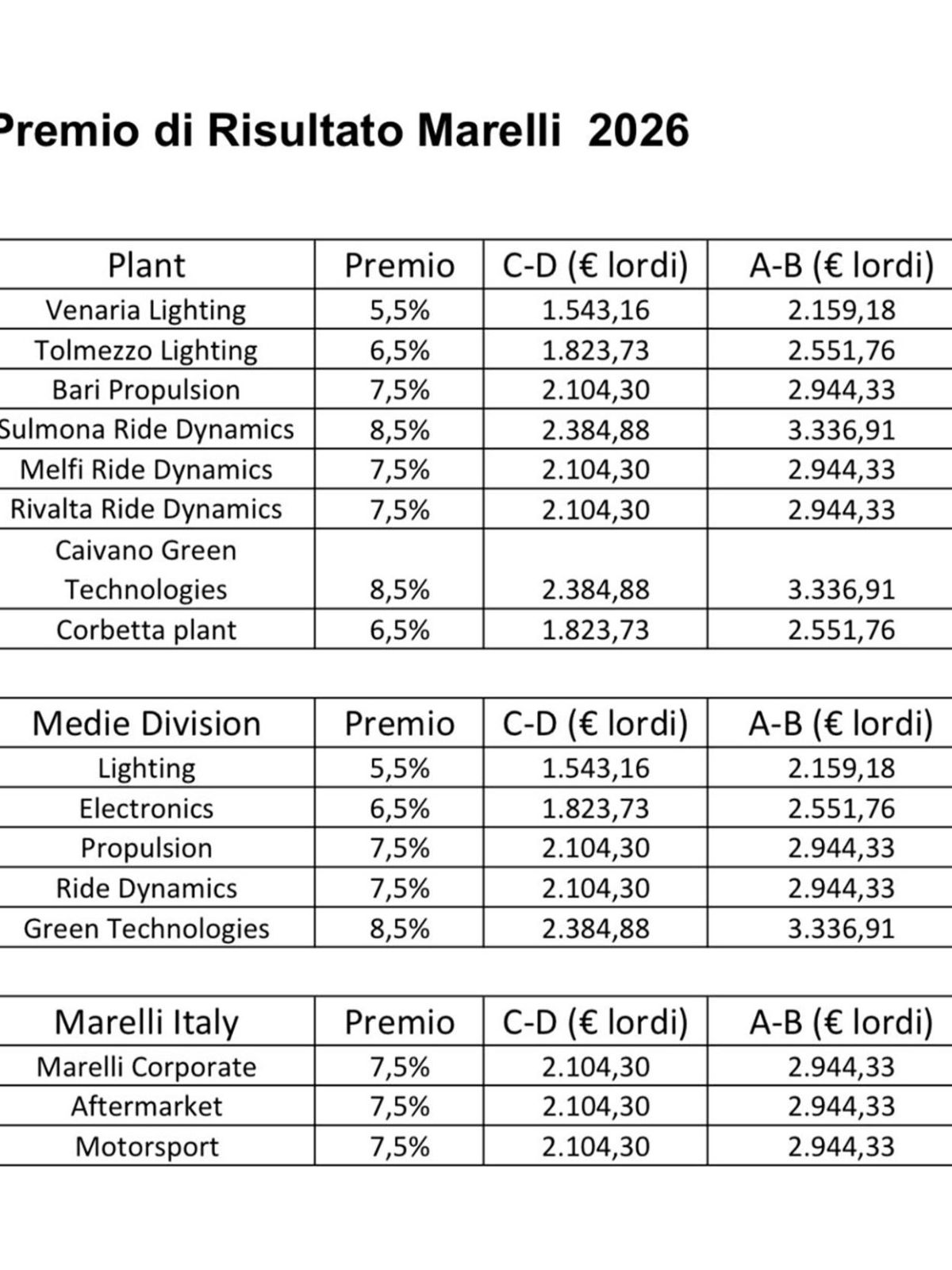 Sono stati comunicati ieri i risultati del premio di risultato che sarà erogato a febbraio sulla base degli andamenti del 2025. I risultati sono positivi in tutti i settori e in tutti gli stabilimenti, con un pagamento medio di 2.104 euro per i campi professionali D e C e 2.944 per i campi professionali A e B, ma comunque variabile per unità produttiva. Il risultato è decisamente migliore dello scorso anno, con circa 650 euro in più.