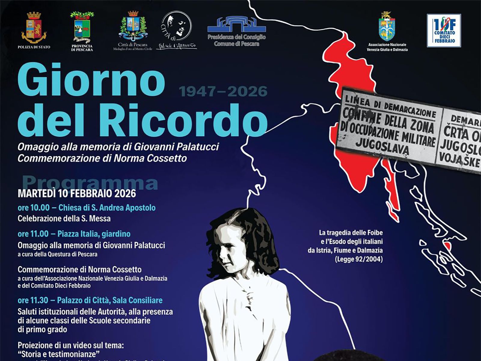 Per il Giorno del Ricordo, alle ore 10 è prevista la celebrazione della santa messa nella chiesa di Sant'Andrea Apostolo. Poi, alle 11, in piazza Italia, la Questura di Pescara ricorderà Giovanni Palatucci mentre l'Associazione nazionale Venezia Giulia e Dalmazia e il Comitato 10 febbraio ricorderanno Norma Cossetto.