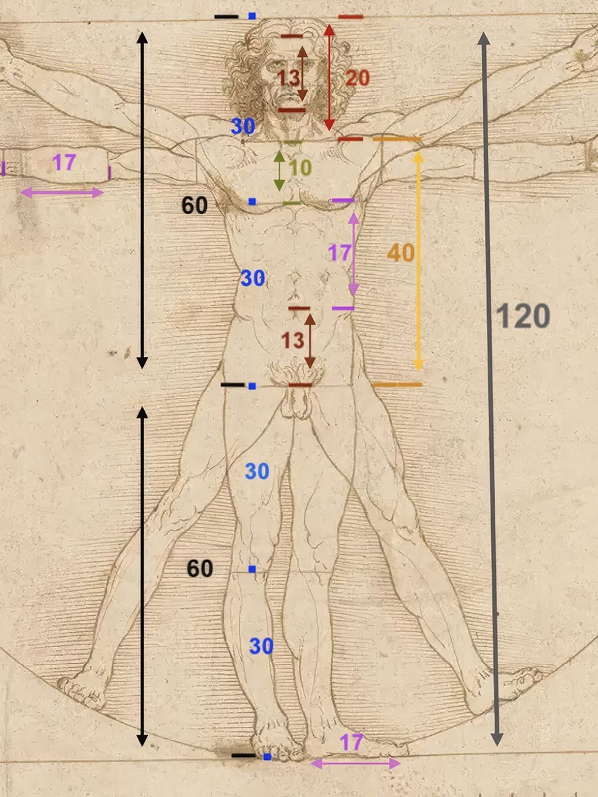 Da un punto di vista matematico, questo numero possiede una divisibilità eccezionale. Prodotto dei primi cinque numeri interi, (1 × 2 × 3 × 4 × 5= 120), consente di esprimere un’ampia gamma di proporzioni sotto forma di numeri interi. Leonardo dispone così di un quadro razionale particolarmente flessibile per organizzare il corpo umano.