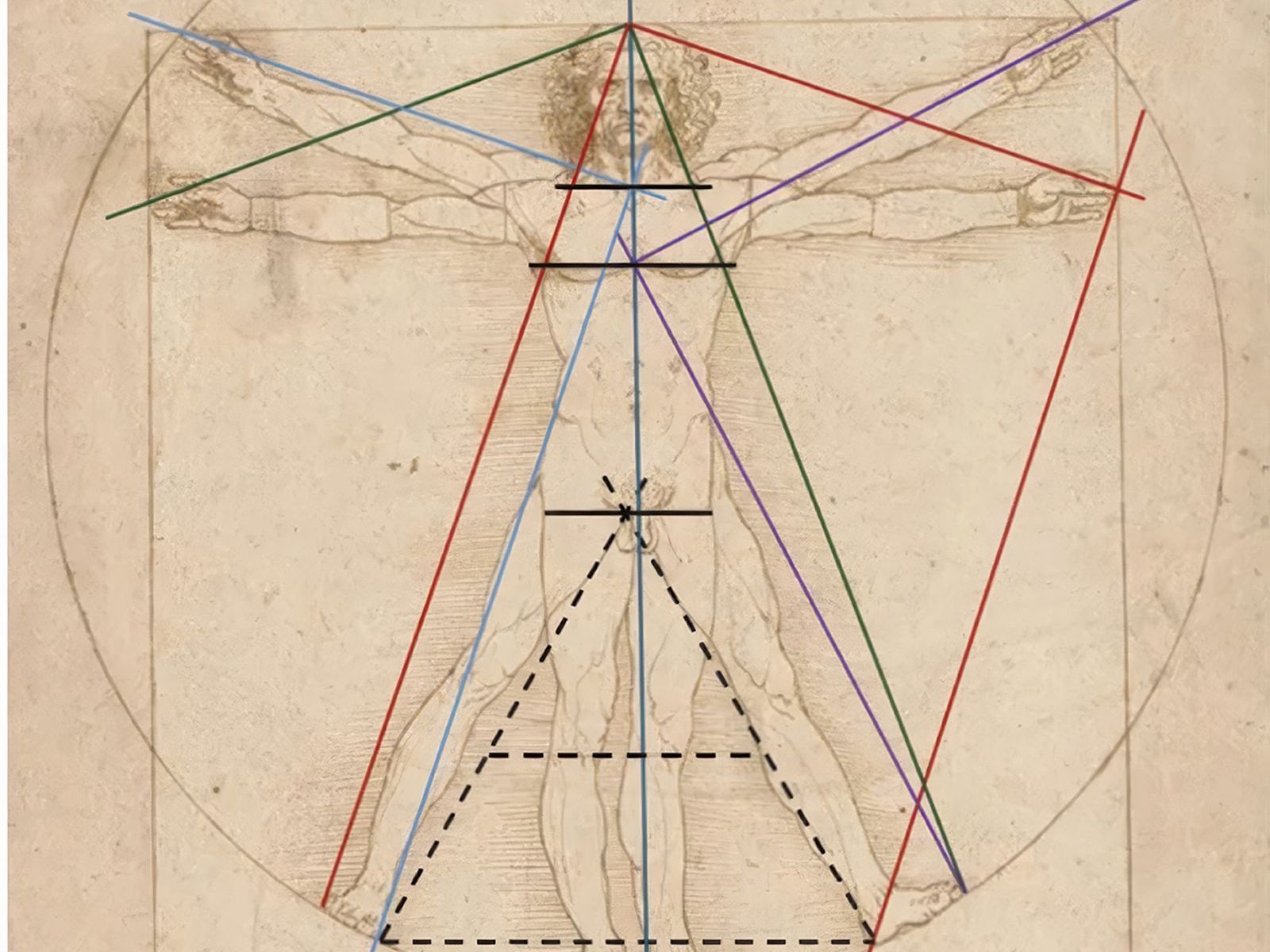 L’uomo Vitruviano rivela anche fino a che punto Leonardo sia un maestro di geometria. L’intera figura è organizzata secondo una logica di straordinaria precisione, nella quale le diverse parti del corpo si articolano attraverso rapporti ortogonali. È proprio così che appare un triangolo equilatero determinato dall’apertura delle gambe a partire dal centro del corpo, il pube e non l’ombelico, come suggeriva Vitruvio. Un secondo triangolo equilatero emerge inoltre all’interno del primo, all’altezza delle ginocchia, a conferma dell’estremo rigore della costruzione.