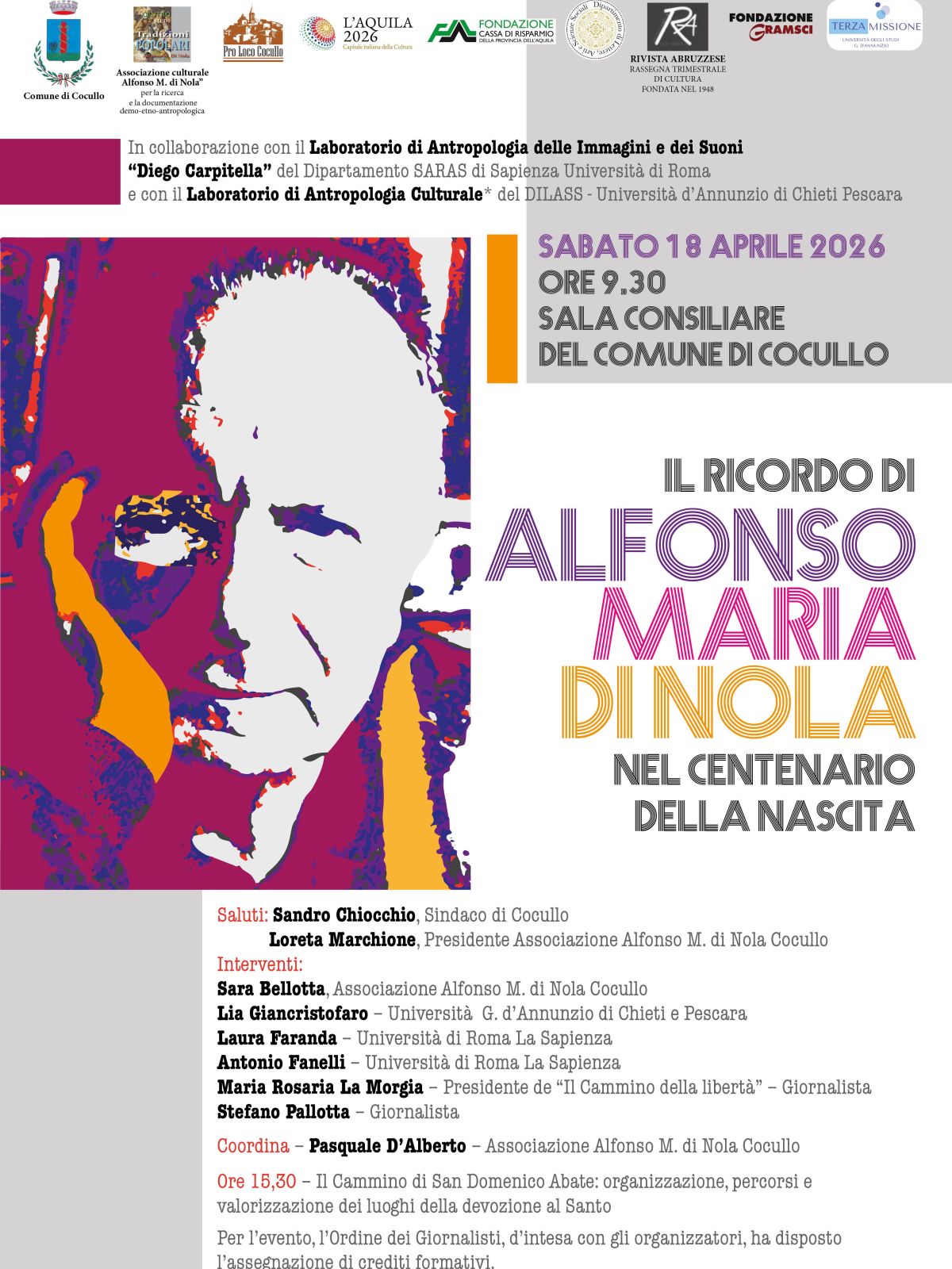 Importante convegno dedicato alla celebrazione della straordinaria carriera dell’eminente antropologo e storico delle religioni, profondamente legato a Cocullo tanto da essere stato insignito della cittadinanza onoraria come colui che, per primo, restituì piena dignità scientifica e morale alla festa di San Domenico Abate e del Rito dei serpari, elevandola a simbolo d’eccellenza della cultura popolare abruzzese e italiana. L’evento ripercorrerà le sue opere e sarà un’occasione di riflessione profonda sull’attualizzazione della visione “dinoliana” nella società moderna.