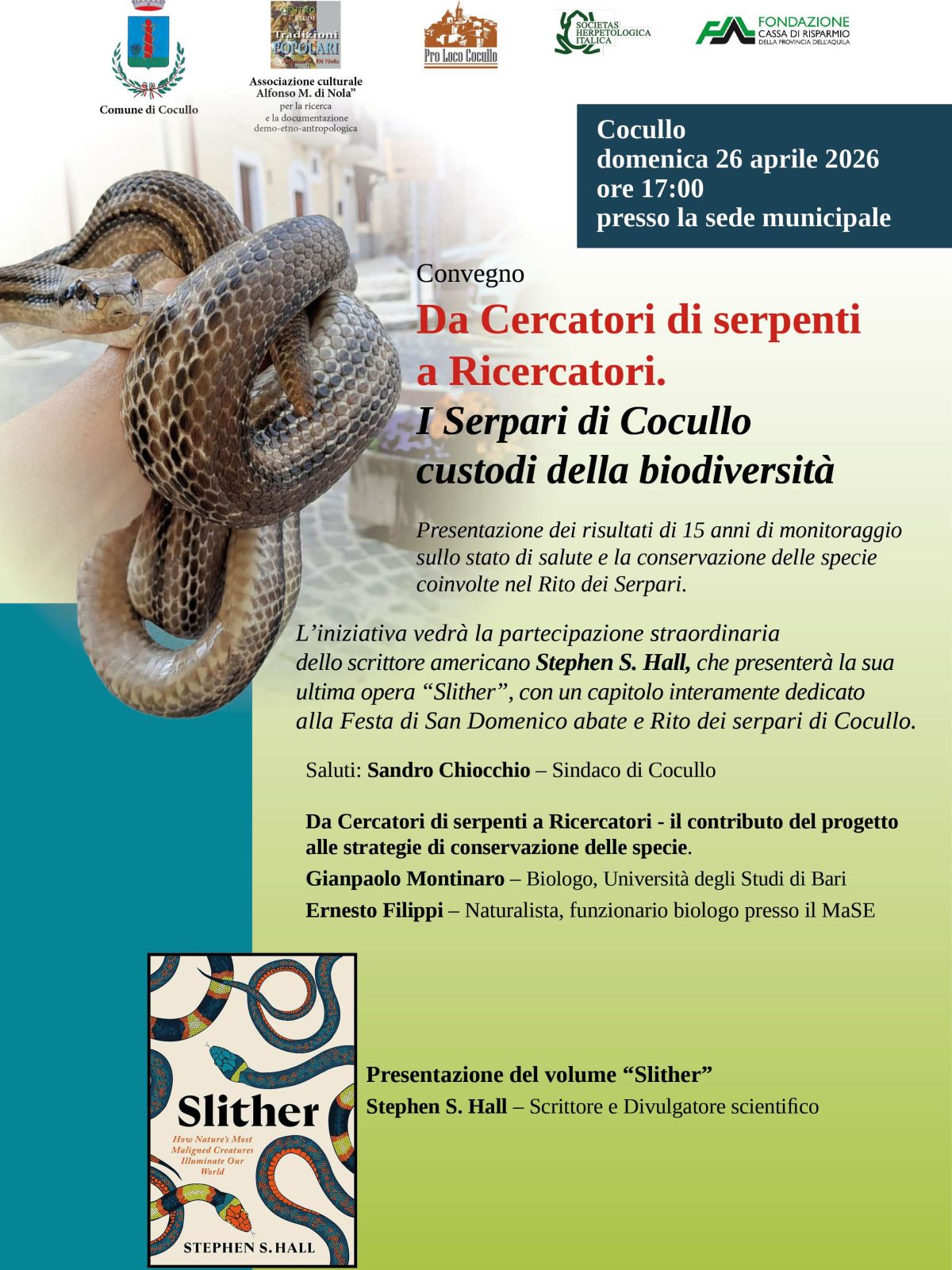 L'iniziativa vedrà anche la partecipazione straordinaria dello scrittore scientifico americano pluripremiato Stephen S. Hall che presenterà la sua ultima opera "Slither", un volume dedicato alla biologia, al fascino e alla conservazione dei serpenti con un capitolo interamente dedicato al Rito dei serpari legato a San Domenico Abate.