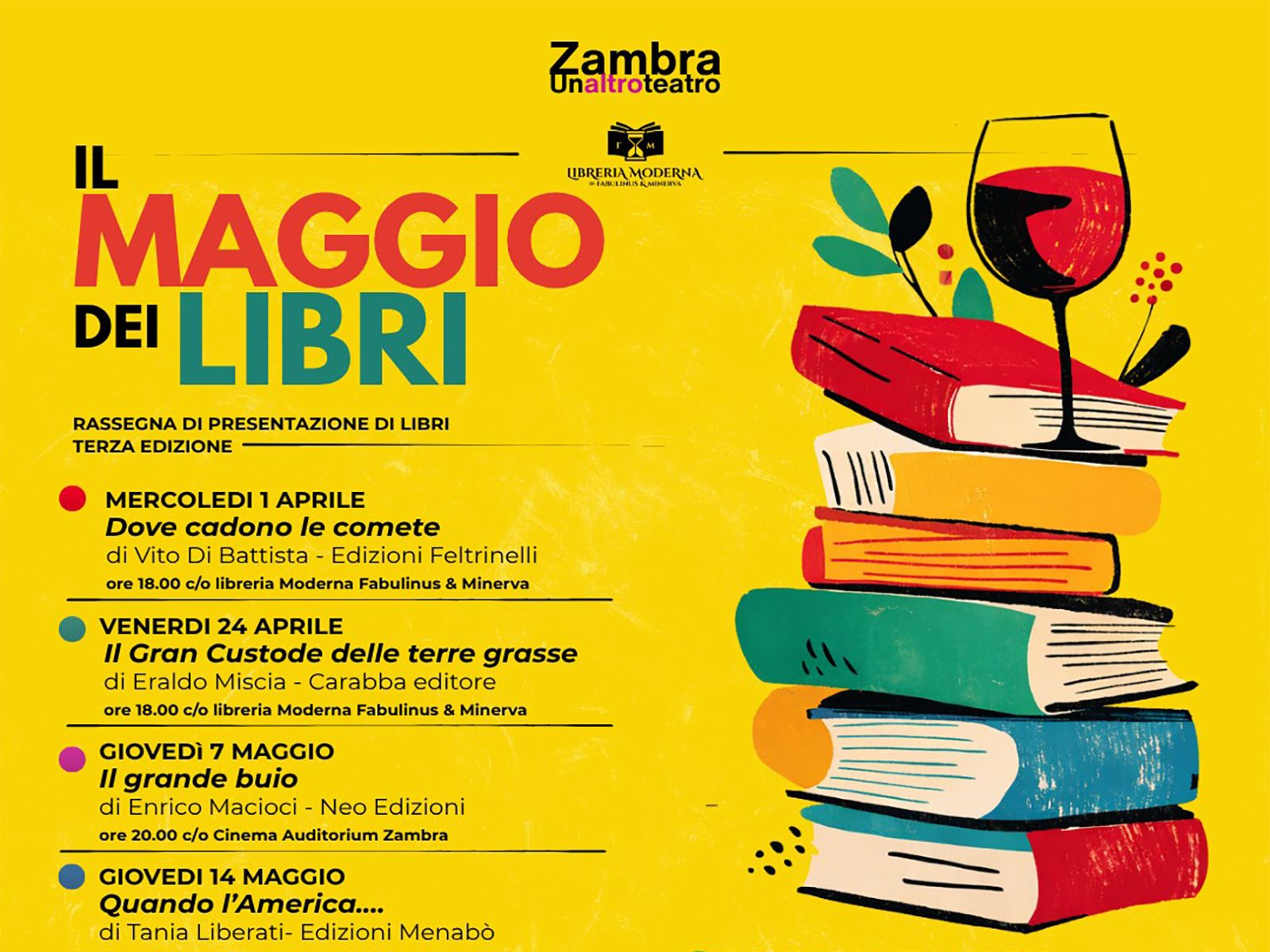 Prosegue con una nuova spinta la terza edizione della rassegna “Il Maggio dei Libri”, nata dalla sinergia tra l' Auditorium Zambra di Ortona (Ch) con Unaltroteatro di Lorenza Sorino e Arturo Scognamiglio e la Libreria Moderna Fabulinus & Minerva di Micaela e Francesco Ortolano che alterneranno anche i rispettivi spazi per gli appuntamenti.