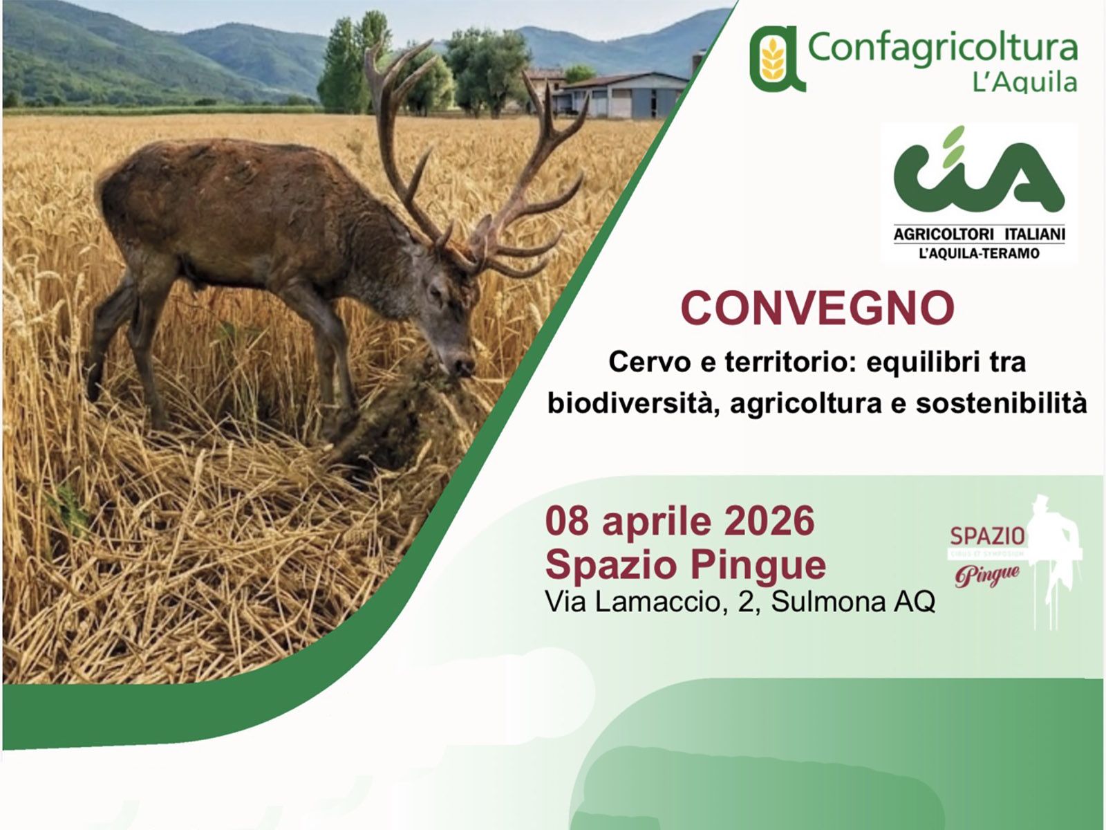 Un tema che sarà al centro del convegno promosso da CIA e Confagricoltura, in programma l’8 aprile 2026 a Sulmona, presso lo Spazio Pingue, Via Lamaccio 2, un momento di confronto aperto tra mondo scientifico, istituzioni e territorio per affrontare in modo concreto la gestione della fauna selvatica.