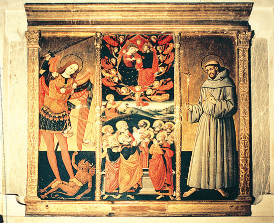 | Il Trittico, venne trafugato nella notte tra 28 e 29 Settembre, dell'anno 1981, dalla Chiesa della Madonna delle Grazie. Vennero rubati i tre riquadri dipinti ad olio sopra un masso di legno, composto di più pezzi. L'insieme ha una forma rettangolare di metri 1,59 x 1,40, coronato da una cornice sostenuta da lesene, adorne di candeline in bassorilievo (la cornice è ancora presente nella chiesa). Il Trittico è di autore ignoto della scuola fiorentina della fine del ‘400. Nel riquadro di centro si svolge la scena della Persecuzione e della Incoronazione della Vergine. Nel riquadro di destra vi è San Francesco di Assisi, mentre in quello di sinistra San Michele Arcangelo. Secondo la tradizione ornava l’ampia cappella comitale del Castello dei signori di Aversa e solo dopo venne donato alla chiesa parrocchiale di San Marcello dai Conti Belprato. Nel 1904 l’opera risulta collocata nella parete centrale della chiesa. Nel 1916, ridotto in pessimo stato, venne restaurato a spese del Ministero della P.I. per interessamento del prof. Hermanin, sopraintendente alle Gallerie e ai Musei. Negli Anni Sessanta fu collocato sopra un manufatto appositamente realizzato nel centro dell’abside della chiesa di S. Maria delle Grazie. Nel 1981 ignoti trafugarono i tre riquadri facendone perdere le tracce. |